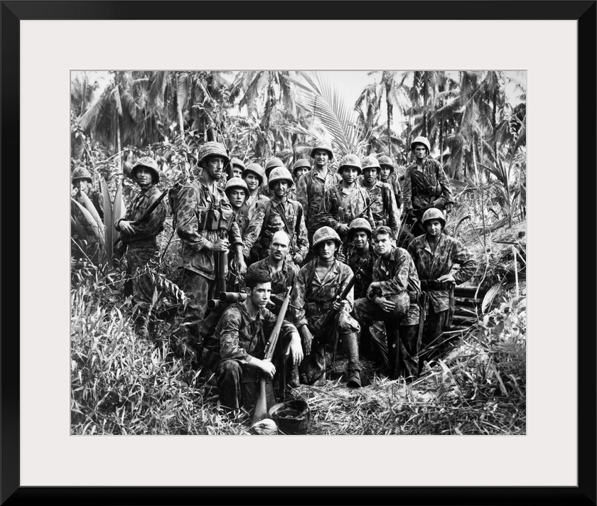 <p>U.S. Marine Raiders posing in front of a Japanese dugout which they helped capture at Cape Torokina, Bougainville, New Guinea, during World War II, January 1944.</p>