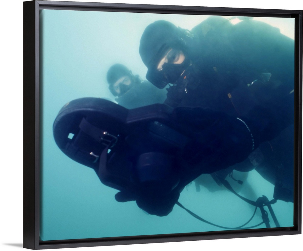 <p>U.S. Navy SEAL combat swimmer pair diving LAR-V pure oxygen rebreather, navigate using a swimmer attack board to reach a target ship in the murky waters of Pearl Harbor, Hawaii.</p>