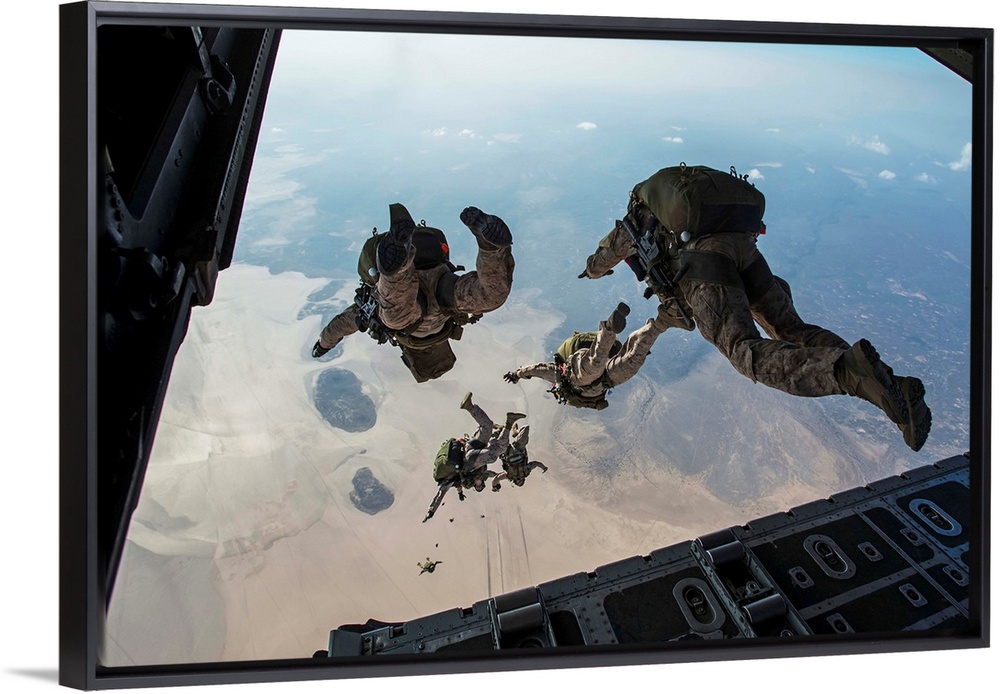 <p>U.S. Pararescuemen and U.S. Marines jump from a HC-130 over Djibouti.</p>