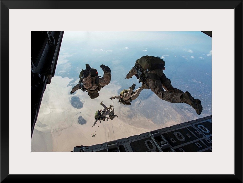 <p>U.S. Pararescuemen and U.S. Marines jump from a HC-130 over Djibouti.</p>