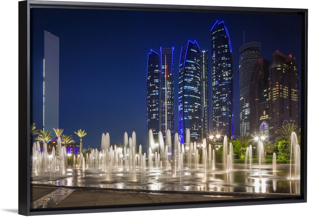 <p>UAE, Abu Dhabi, Emirates Palace Hotel fountains and Etihad Towers, dusk</p>