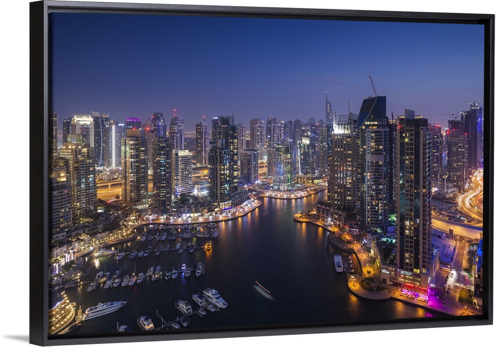 <p>UAE, Dubai, Dubai Marina, elevated view of the marina, dusk</p>