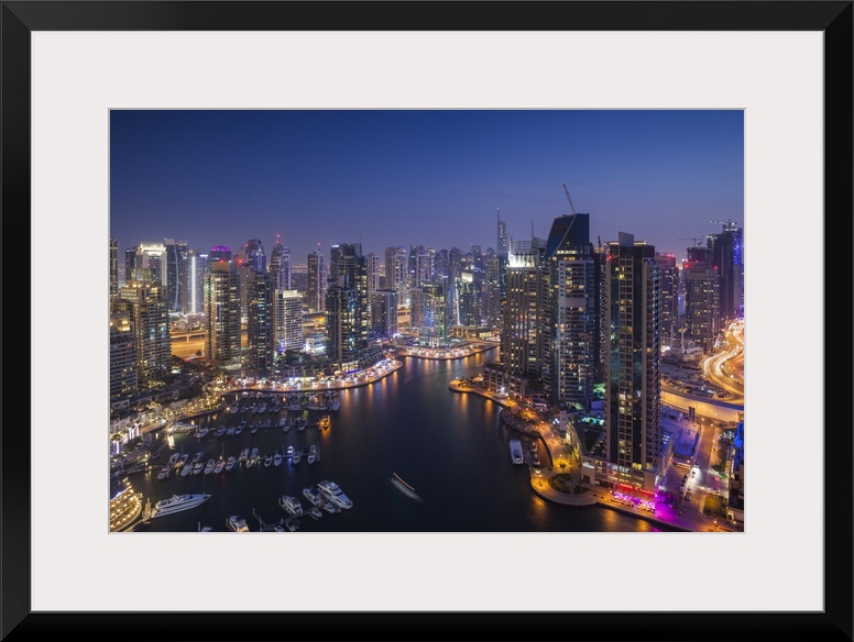 <p>UAE, Dubai, Dubai Marina, elevated view of the marina, dusk</p>