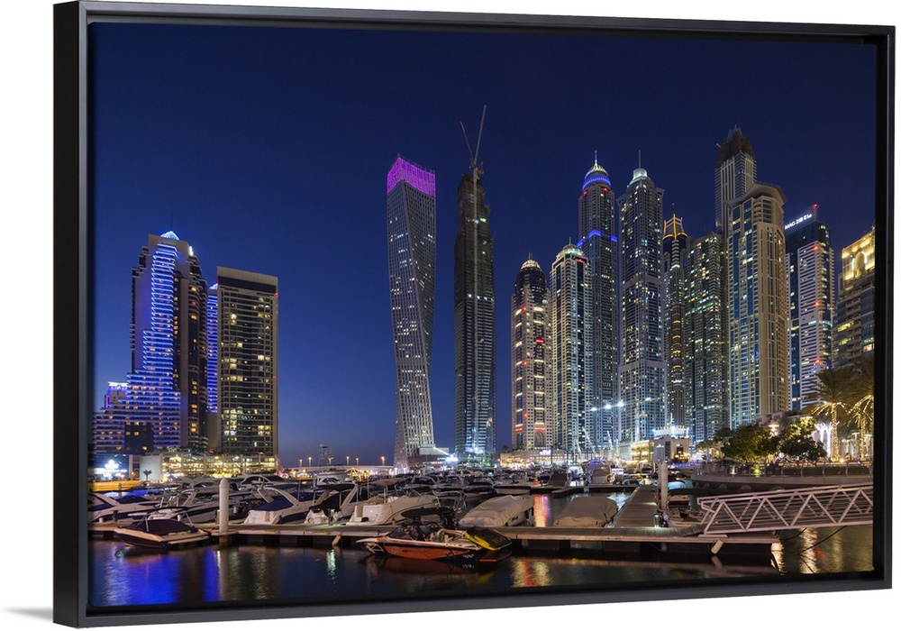 <p>UAE, Dubai, Dubai Marina, high rise buildings including the twisted Cayan Tower, dusk</p>