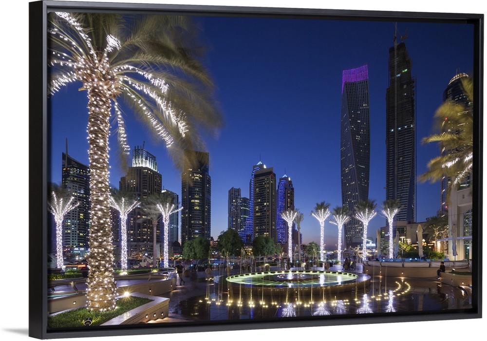 <p>UAE, Dubai, Dubai Marina, high rise buildings including the twisted Cayan Tower, dusk</p>