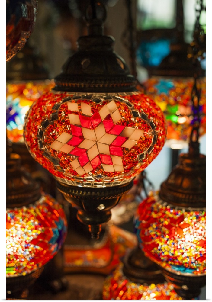 <p>UAE, Dubai, Jumeirah, Madinat Jumeirah, souk shopping area, souvenir lamps</p>