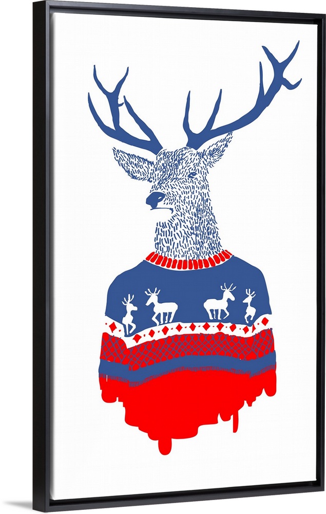<p>Humorous illustration of a deer wearing a tacky red and blue sweater.</p>