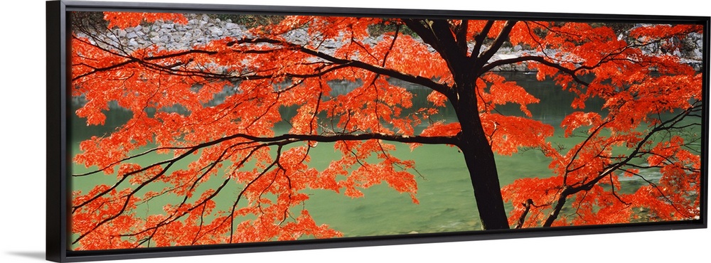 <p>A large tree with colorful leaves on its long branches grows on the banks of the Uji River in Kyoto, Japan in this large panoramic photograph.</p>