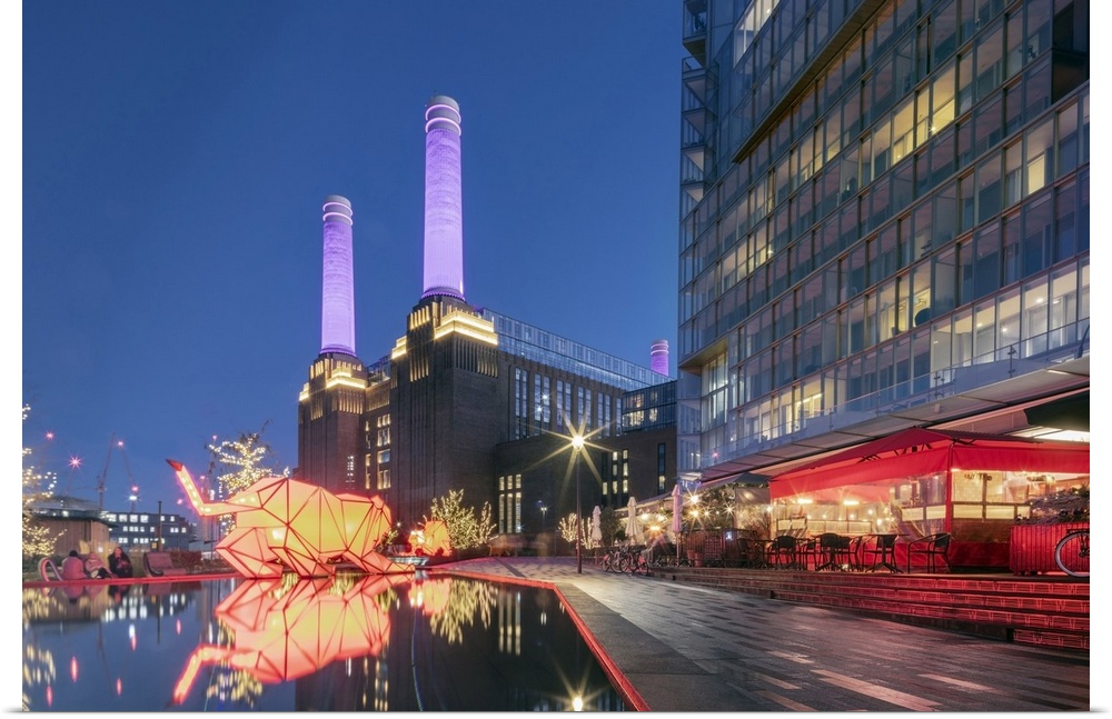 <p>UK, England, London, Borough of Wandsworth. Night view of Battersea Power Station (architects: Leonard Pearce & Giles Gilbert Scott, 1929-19350 and modern retail and residential buildings by Frank Gehry.</p>