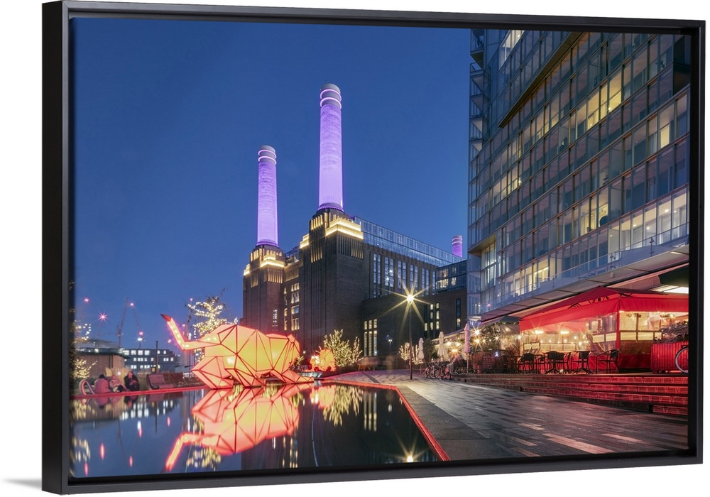 <p>UK, England, London, Borough of Wandsworth. Night view of Battersea Power Station (architects: Leonard Pearce & Giles Gilbert Scott, 1929-19350 and modern retail and residential buildings by Frank Gehry.</p>