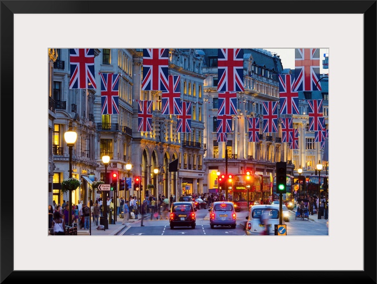 <p>UK, England, London, Regent Street, Union Jack Flags marking the Royal Wedding of Prince William and Kate Middleton</p>