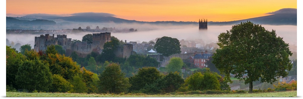 <p>UK, England, Shropshire, Ludlow, Ludlow Castle And St Laurence's Church At Sunrise</p>