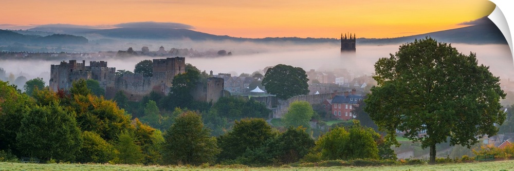 <p>UK, England, Shropshire, Ludlow, Ludlow Castle And St Laurence's Church At Sunrise</p>