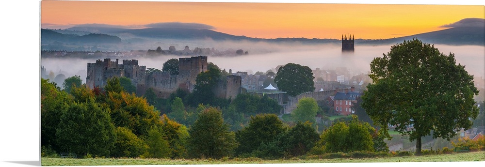 <p>UK, England, Shropshire, Ludlow, Ludlow Castle And St Laurence's Church At Sunrise</p>