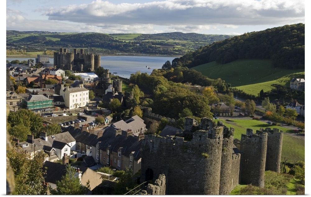 <p>UK, North Wales, Conwy. View of the town and castle with the Conwy River behind.</p>