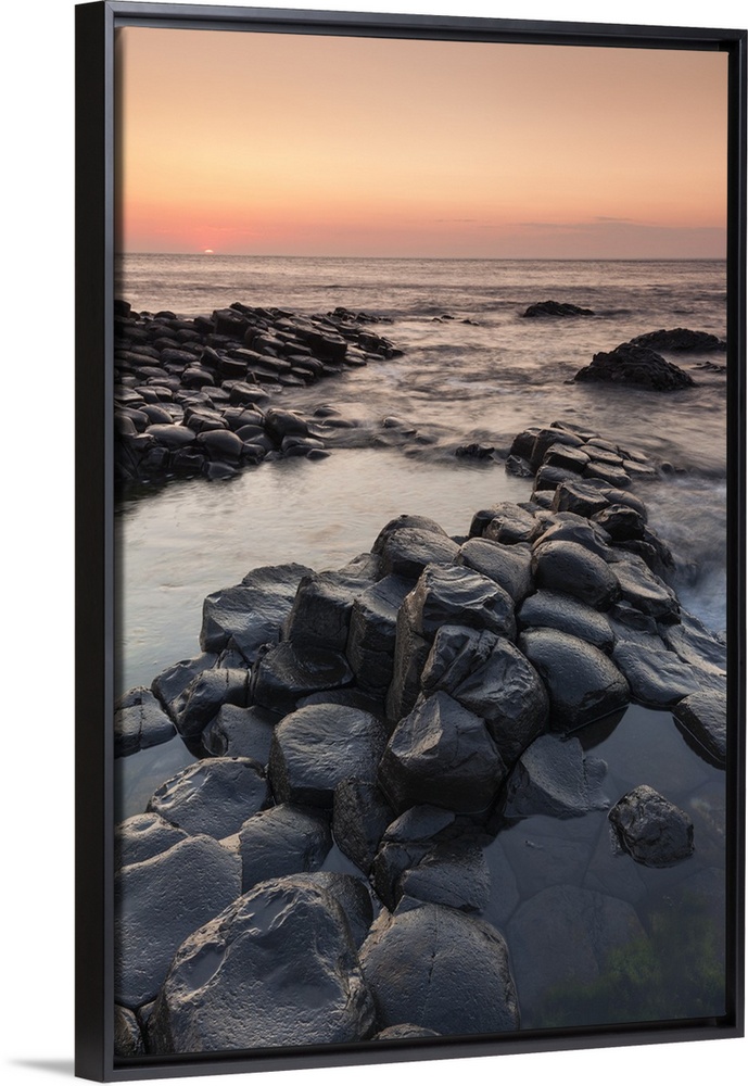 <p>UK, Northern Ireland, County Antrim, Bushmills, Giants Causeway, Unesco World Heritage Site, coastal rock formation of basalt at dusk.</p>