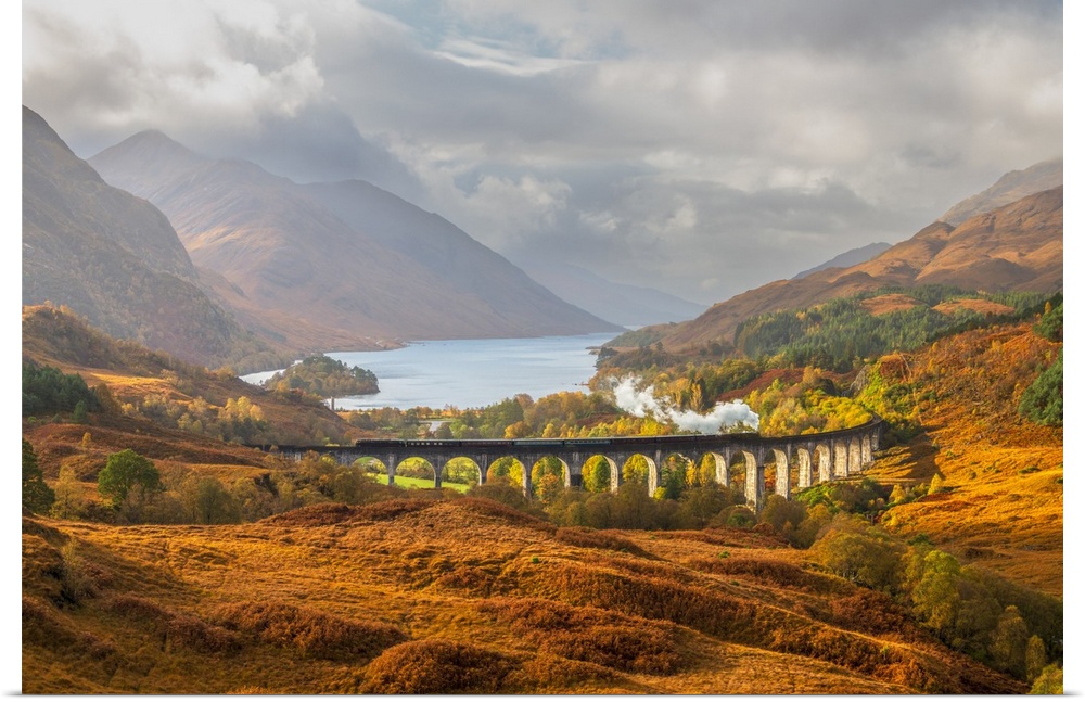 <p>UK, Scotland, Highland, Loch Shiel, Glenfinnan, Glenfinnan Railway Viaduct, part of the West Highland Line, made famous in JK Rowling's Harry Potter as the Hogwarts Express</p>