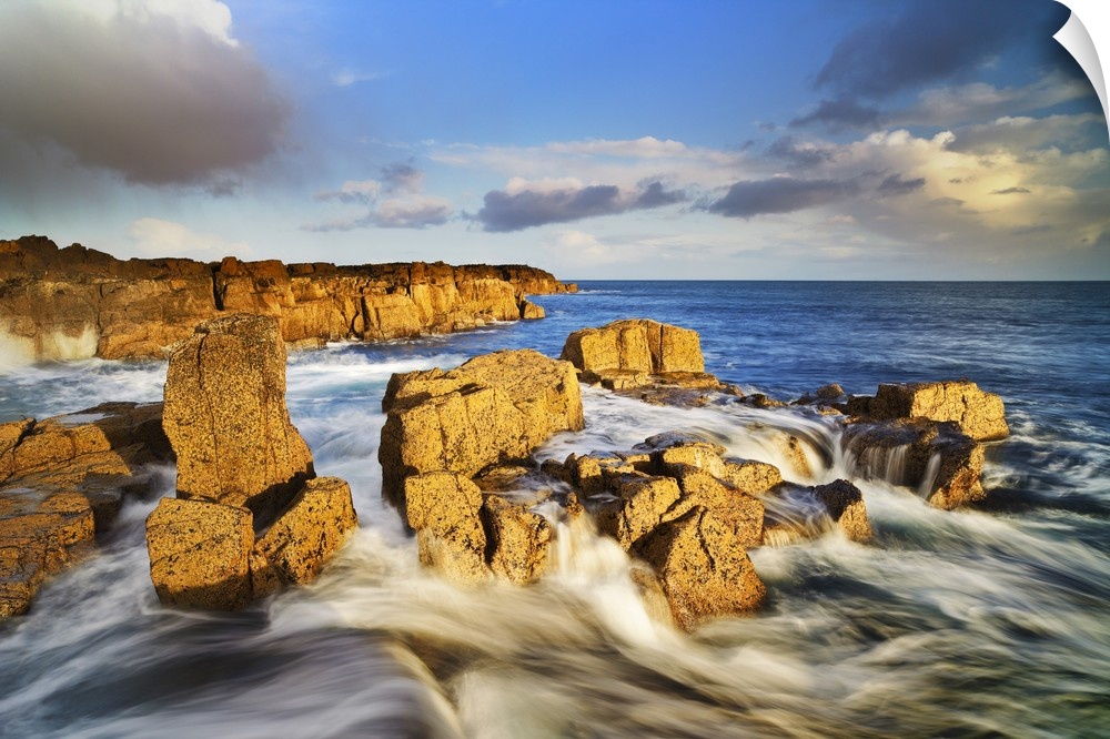<p>United Kingdom, UK, Scotland, Inner Hebrides, Contrast between the yellow rocks and the blue water at Staffin Bay</p>