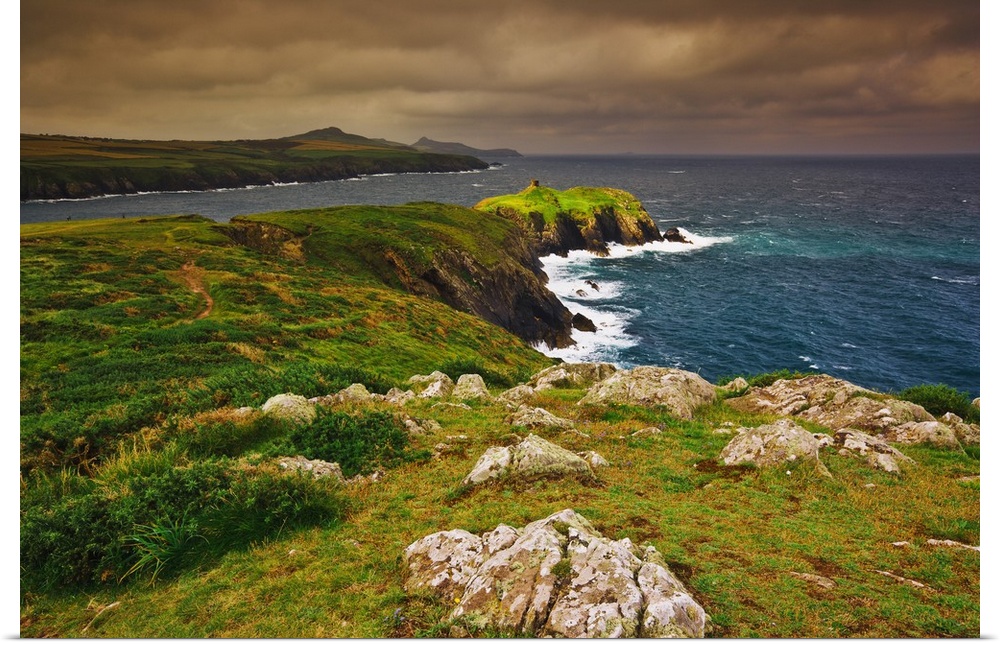 <p>Coastal landscape at Ynis Barri (Barri Island), between Porthgain and Abereiddy, looking towards St. David's Head, with the ruins of Abereiddy tower in the background. This former Island is located in the Pembrokeshire Coast National Park.</p>