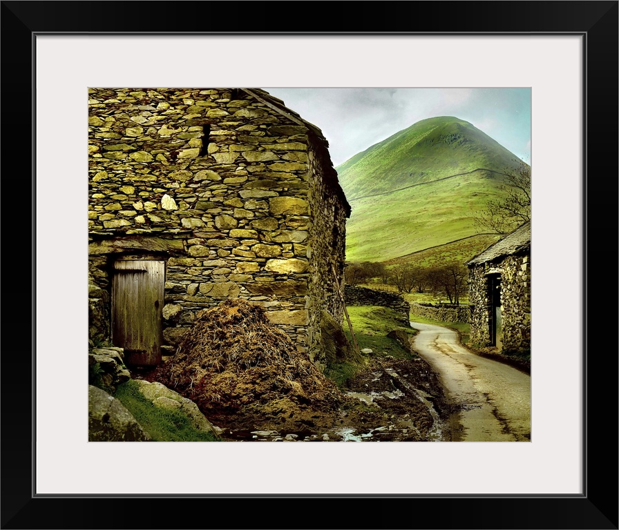 <p>A stone barn and country lane near a hillside</p>