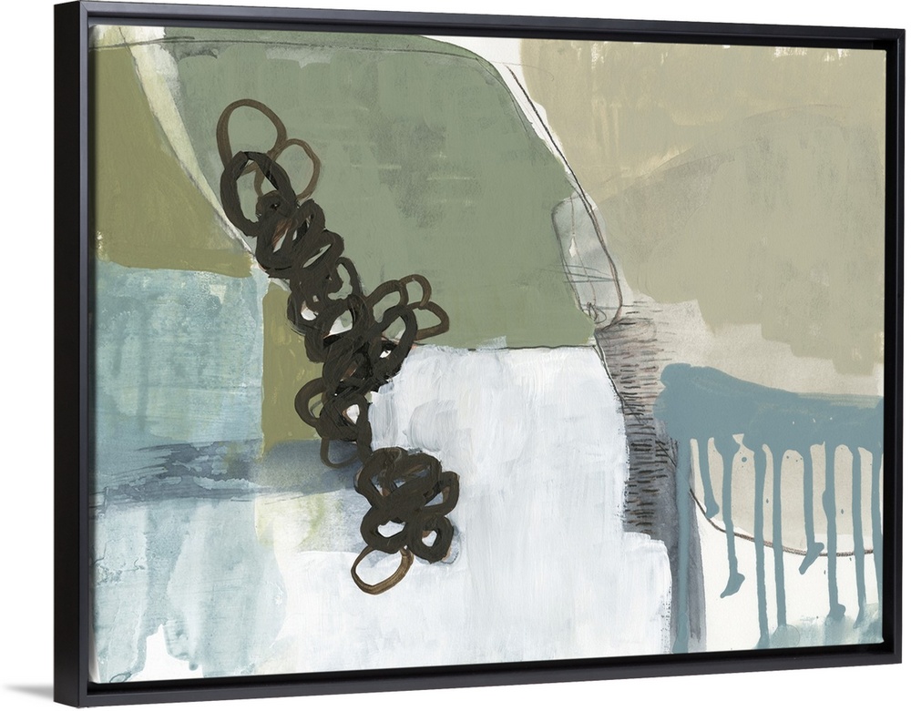 <p>Contemporary abstract painting with paint drips, circular shapes and blocks of color in olive green, blue, and dusty pink.</p>