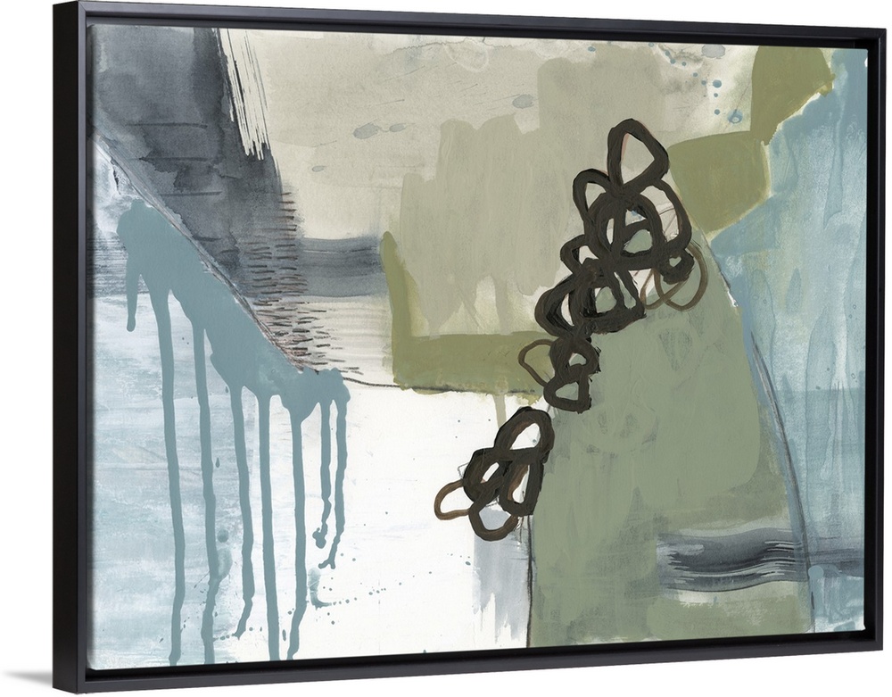 <p>Contemporary abstract painting with paint drips, circular shapes and blocks of color in olive green, blue, and dusty pink.</p>