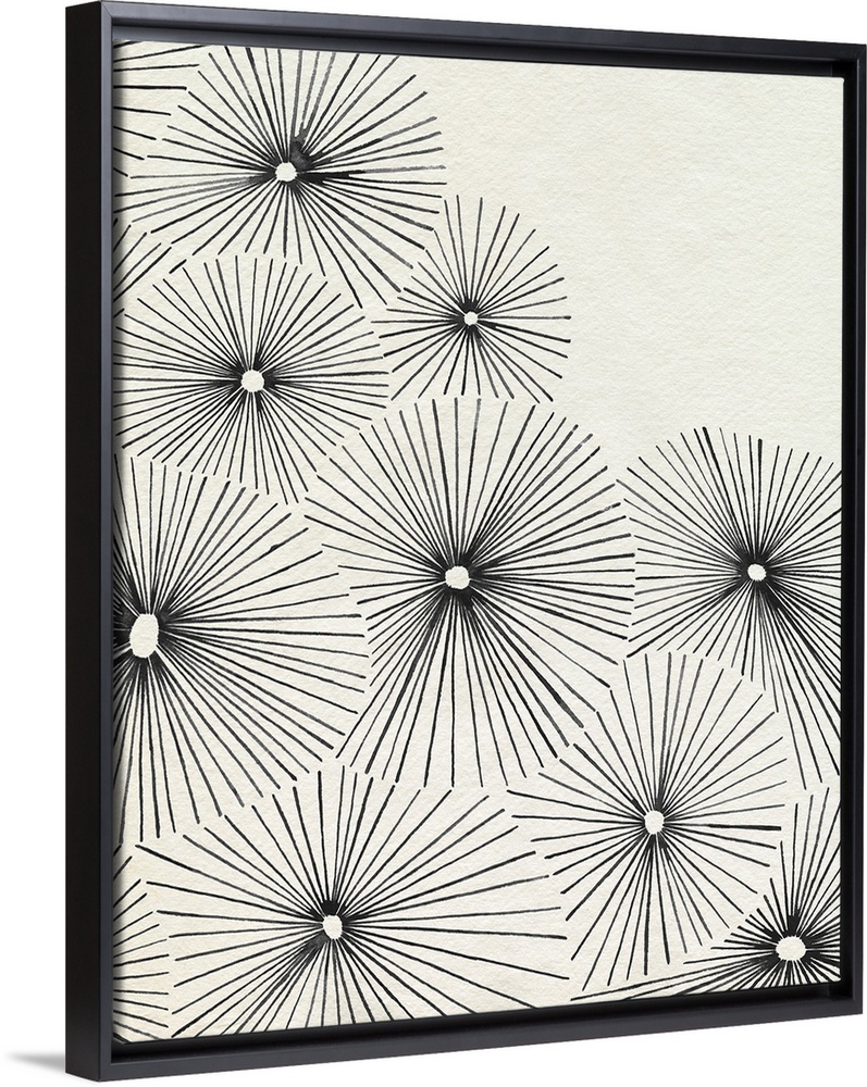 <p>A very minimalist contemporary illustration of overlapping circles of radiating spokes that resemble opened umbrellas in a neutral color scheme.</p>