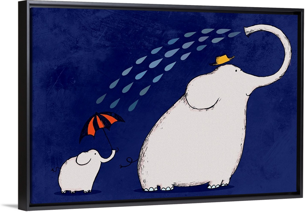 <p>Canvas print of a large elephant blowing water out of their trunk behind them at a smaller elephant holding up an umbrella.</p>