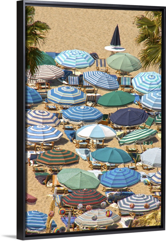 <p>Photograph of rows of beach umbrellas in solids and stripes, mostly in blue and green.</p>