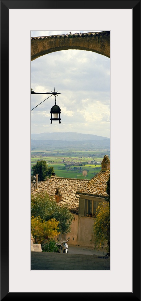 <p>Vertical panoramic photograph of tree tops and roofs with an open meadow and mountains in the distance under a cloudy sky seen through an stone corridor.</p>