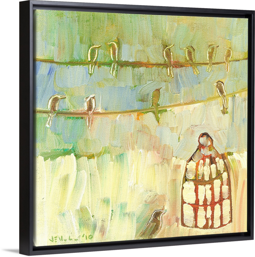 <p>Painting of birds resting on a power line with a cage on the ground in a mix of cool and warm tones creating a rough texture.</p>