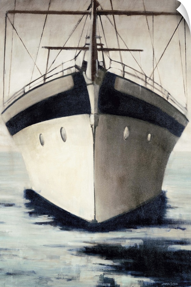 <p>Painting of the bow of a large sailboat on the water.</p>