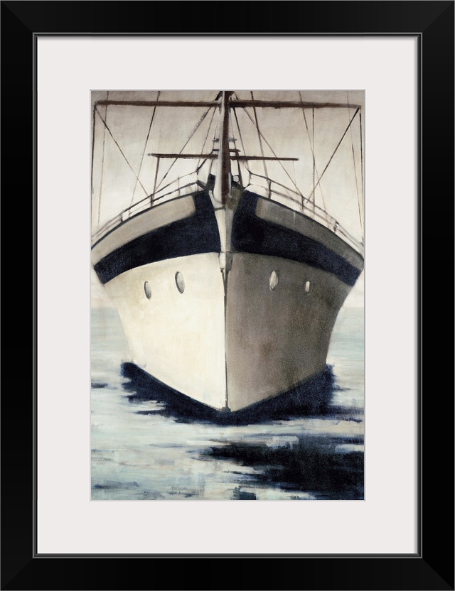 <p>Painting of the bow of a large sailboat on the water.</p>