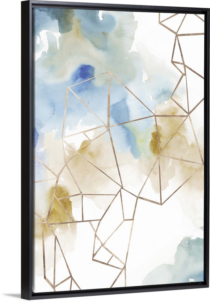 <p>Abstract watercolor painting of blue and brown with geometric gold lines.</p>