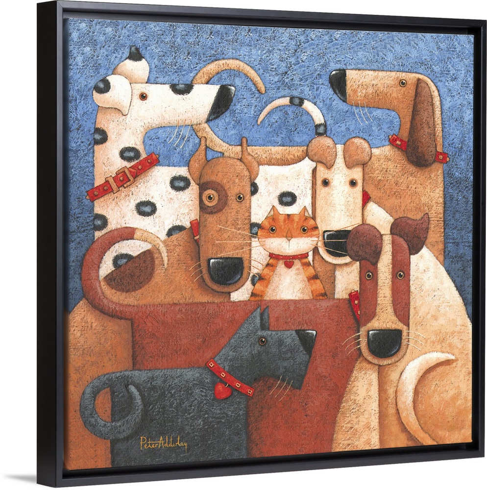 <p>Contemporary painting of a group of dogs all huddled together, with a a cat poking its head out from the middle of the group.</p>