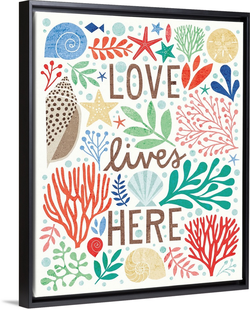 <p>Beach themed illustration with seashells, coral, starfish, and various saltwater plants.</p>