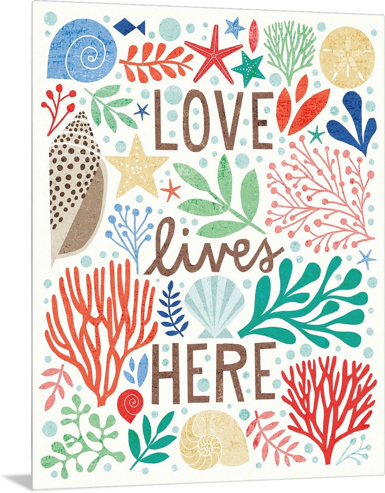 <p>Beach themed illustration with seashells, coral, starfish, and various saltwater plants.</p>