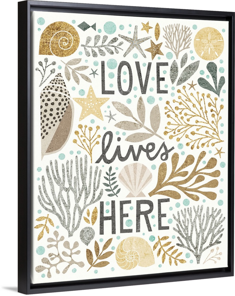 <p>Beach themed illustration with seashells, coral, starfish, and various saltwater plants.</p>