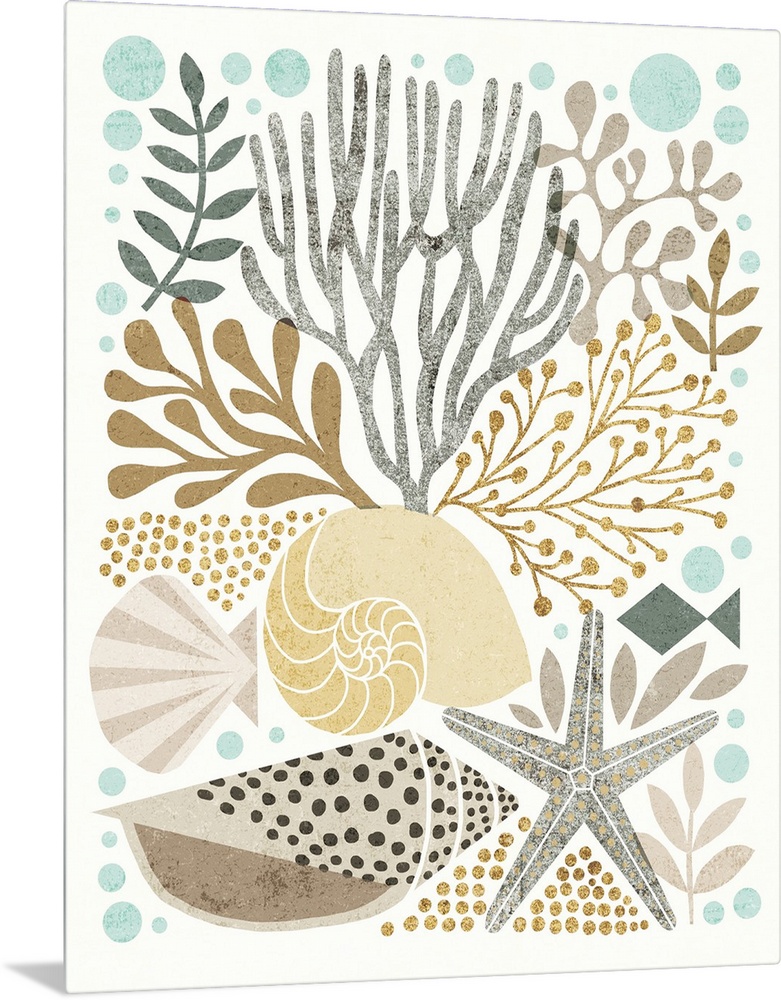 <p>Beach themed illustration with seashells, coral, starfish, and various saltwater plants.</p>