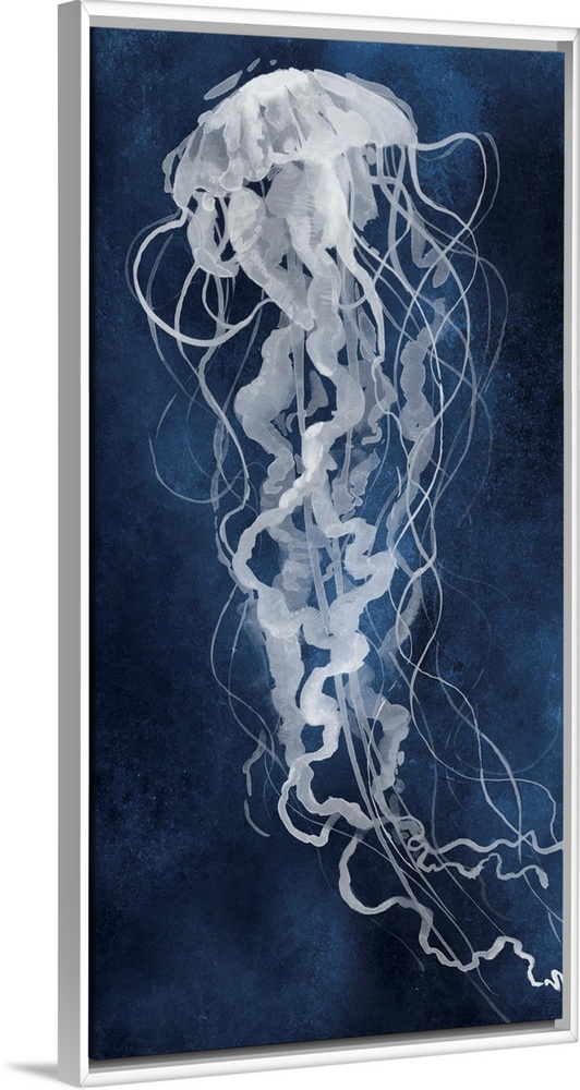 <p>Large panel watercolor painting of a white jellyfish on an indigo background.</p>
