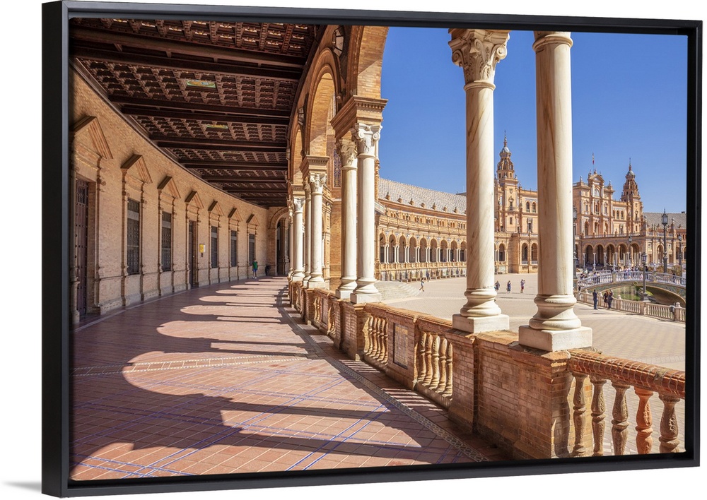 <p>Under the arches of the semicircular Plaza de Espana, Maria Luisa Park, Seville, Andalusia, Spain, Europe</p>