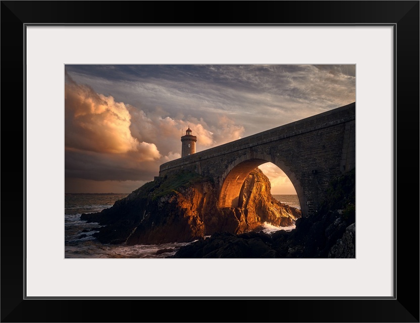 <p>Warm photograph of a rocky bridge over the ocean with an orange sunlit tunnel and a lighthouse on the end at sunrise.</p>