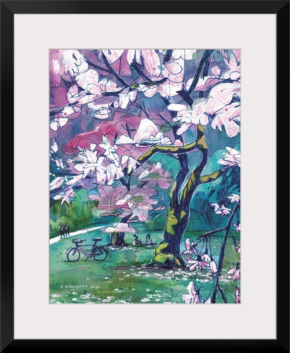 <p>March is for cherry blossoms. Abstracted clouds of flowers hang above people having picnics and walking through the park. This was drawn at Seattle's Washington Park Arboretum, though it could be anywhere where there are cherry trees. The artist used acrylic, watercolor, and markers to make this piece.</p>