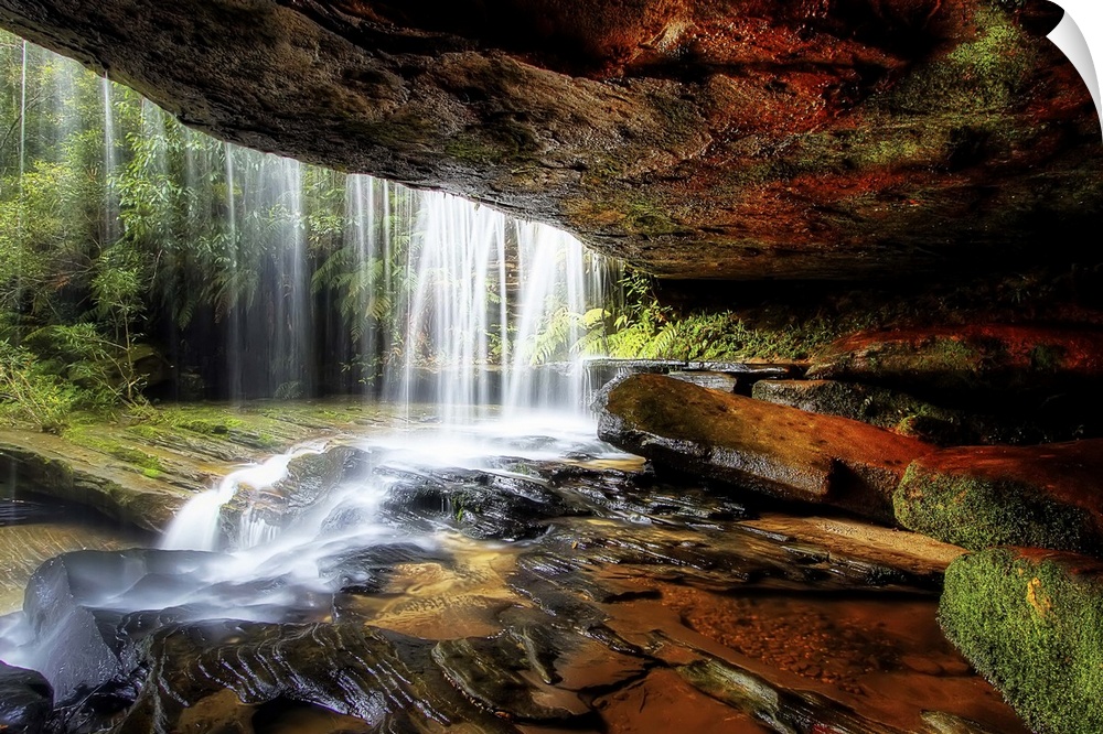 <p>A cave behind a waterfall with wet stones and moss.</p>