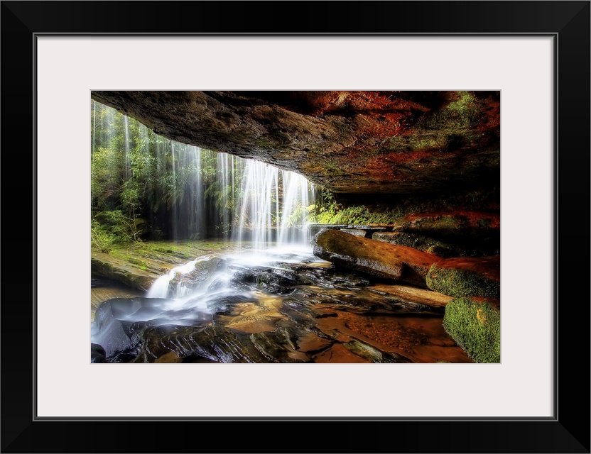 <p>A cave behind a waterfall with wet stones and moss.</p>