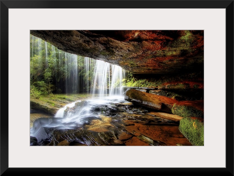 <p>A cave behind a waterfall with wet stones and moss.</p>