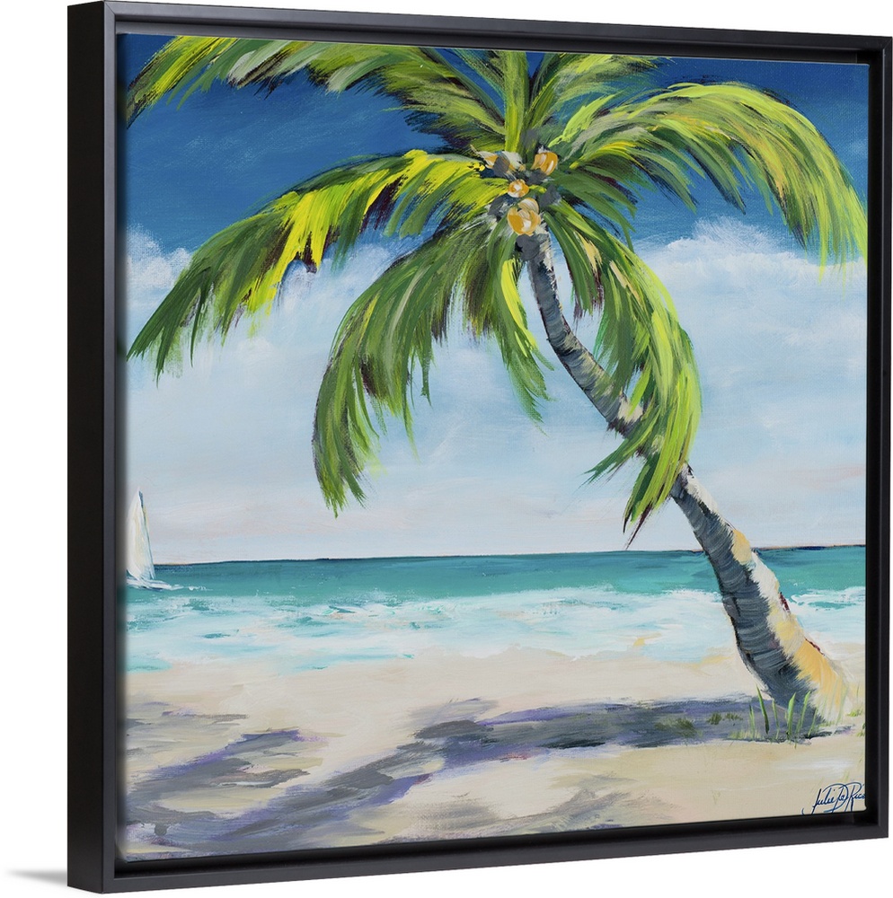 <p>Square painting of a relaxing coastal scene with a sandy beach and a big palm tree with a sailboat in the distance.</p>