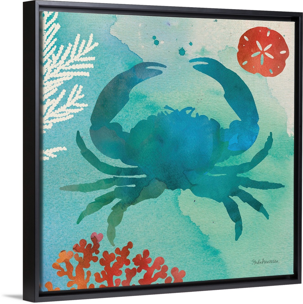 <p>A square contemporary watercolor design of a blue crab with ocean elements.</p>