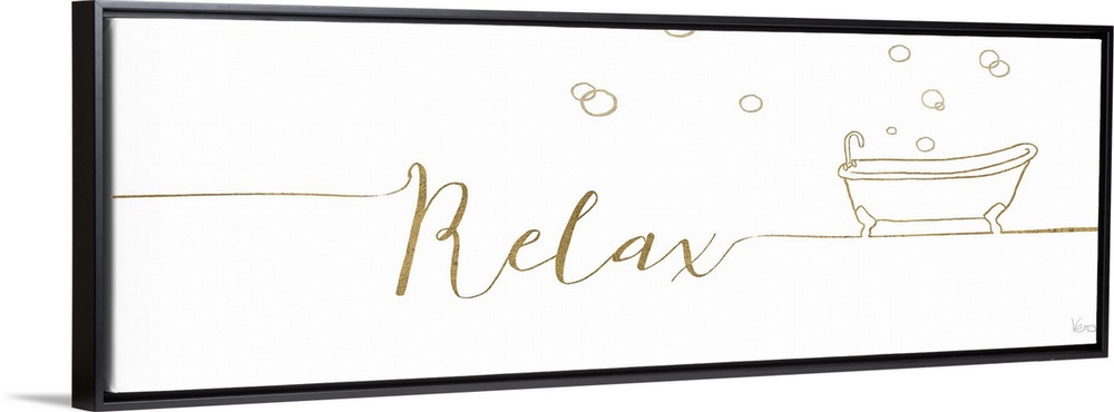 <p>White and gold bathroom decor with the word "Relax" written on the side, an illustration of a bathtub, and floating bubbles all around.</p>