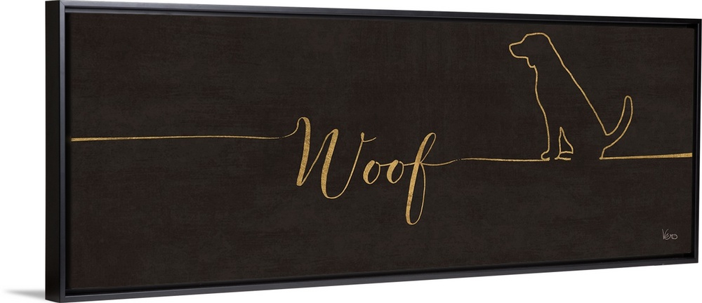 <p>"Woof" with the outline of a dog sitting on a textured black background.</p>